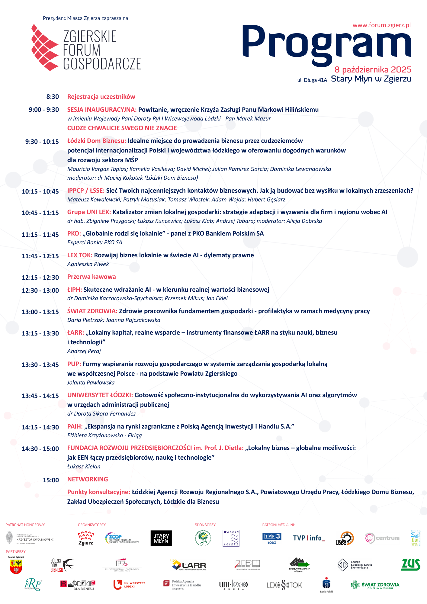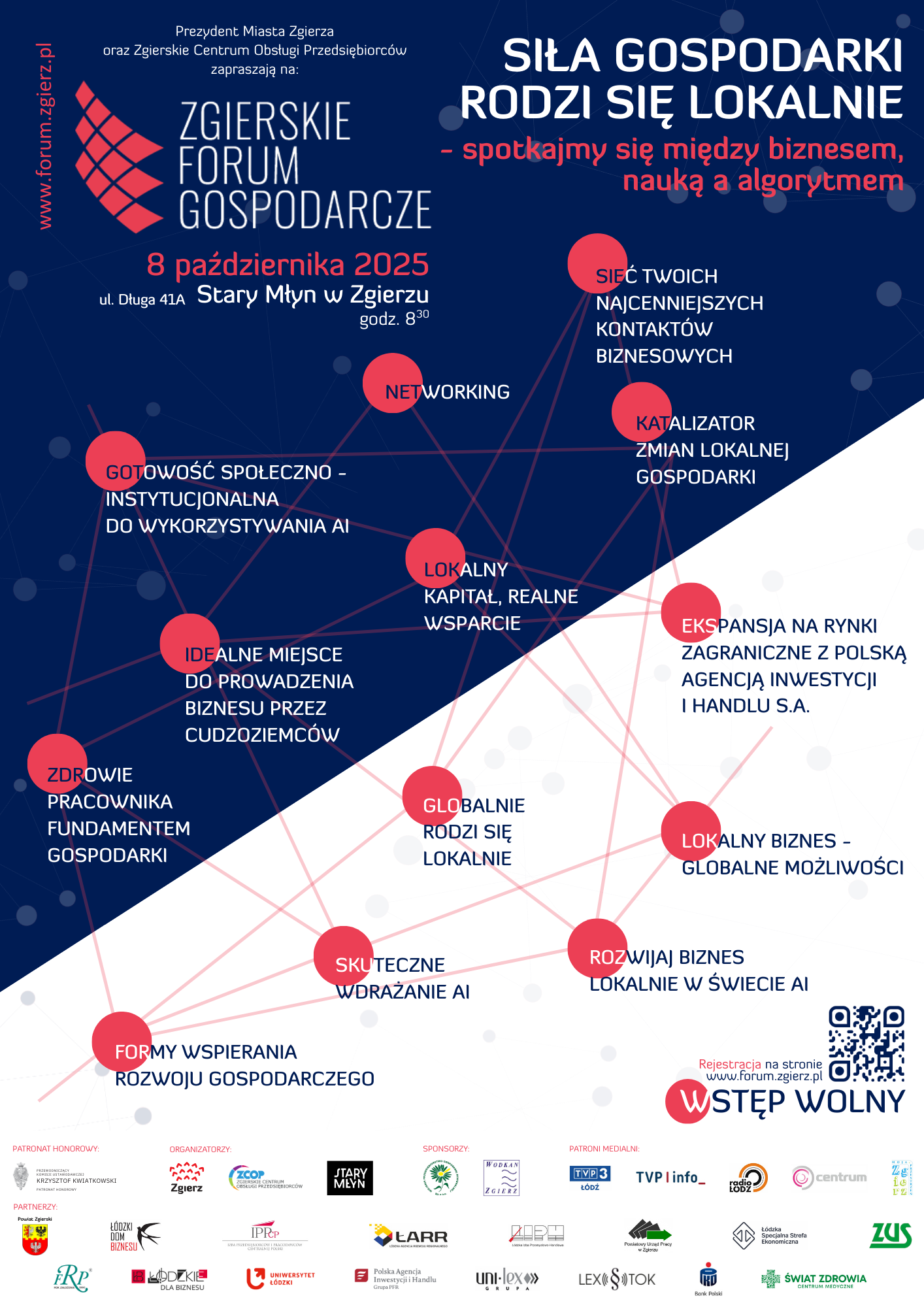 Serdecznie zapraszamy do udziału w Zgierskim Forum Gospodarczym, które odbędzie się w dniu 8 października 2025 r. w przestrzeni Starego Młyna w Zgierzu.